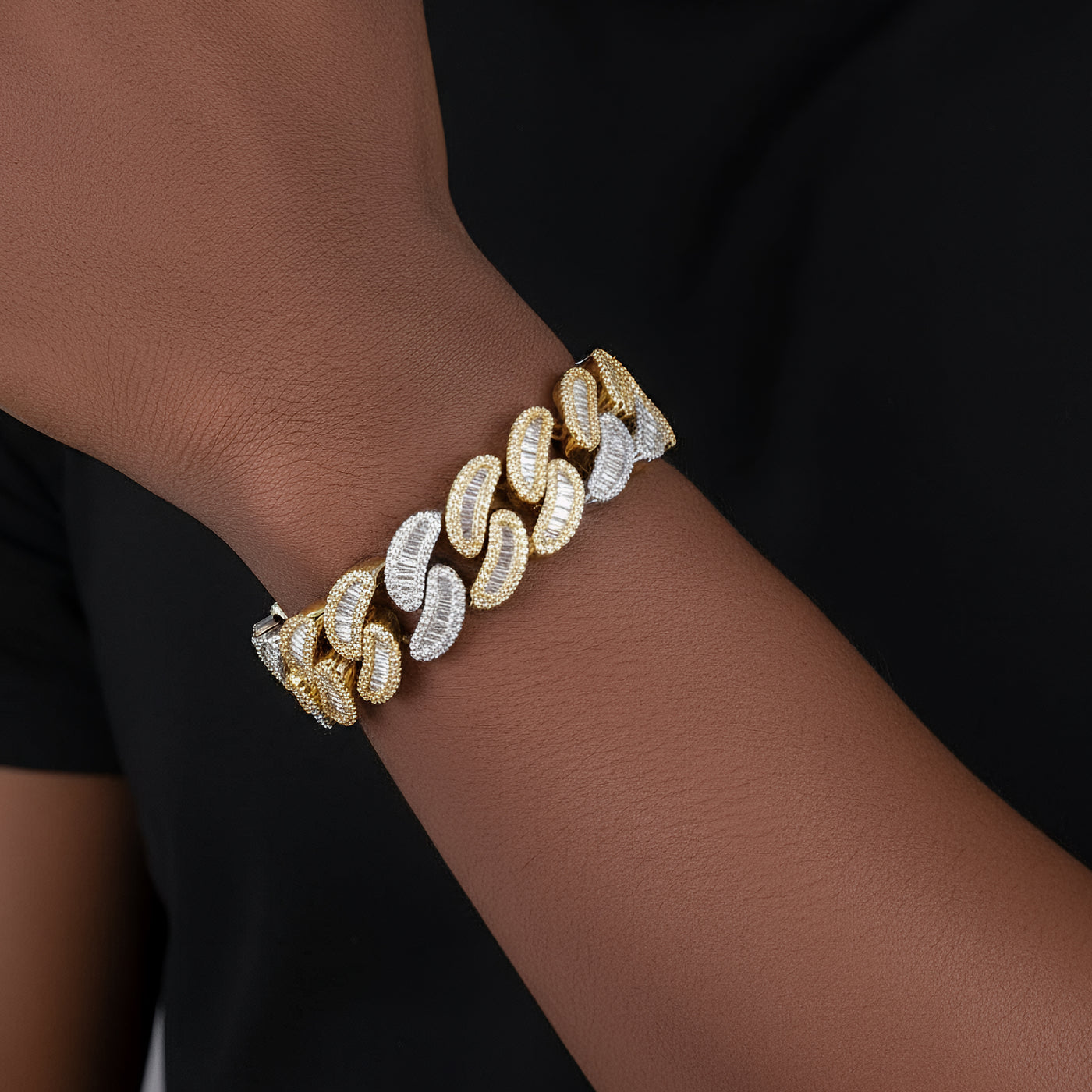 This Master Of Bling 18mm Bracelet Is studded with handset Baguette Moissanite diamonds throughout the links. Each Link is Immaculately crafted for the Bracelet to rest perfectly around your wrist.