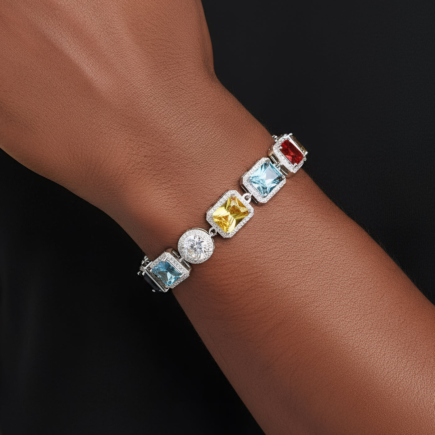 This Master Of Bling Designer Bracelet is made of pure 925 sterling silver, studded with Colored Gemstones & Moissanite diamonds throughout the link.