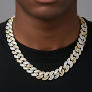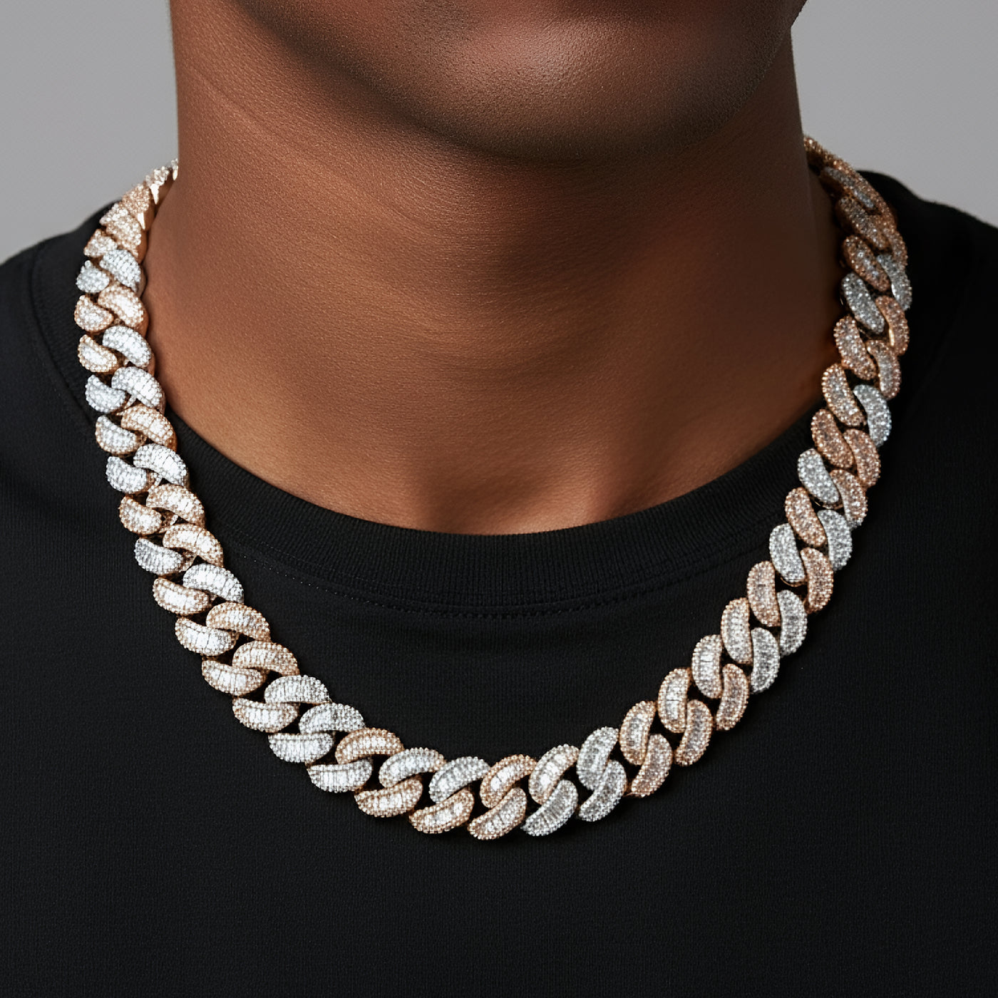 This Master Of Bling 18mm Necklace Is studded with handset Baguette Moissanite diamonds throughout the links. Each Link is Immaculately crafted for the Chain to rest flat around your Neck.